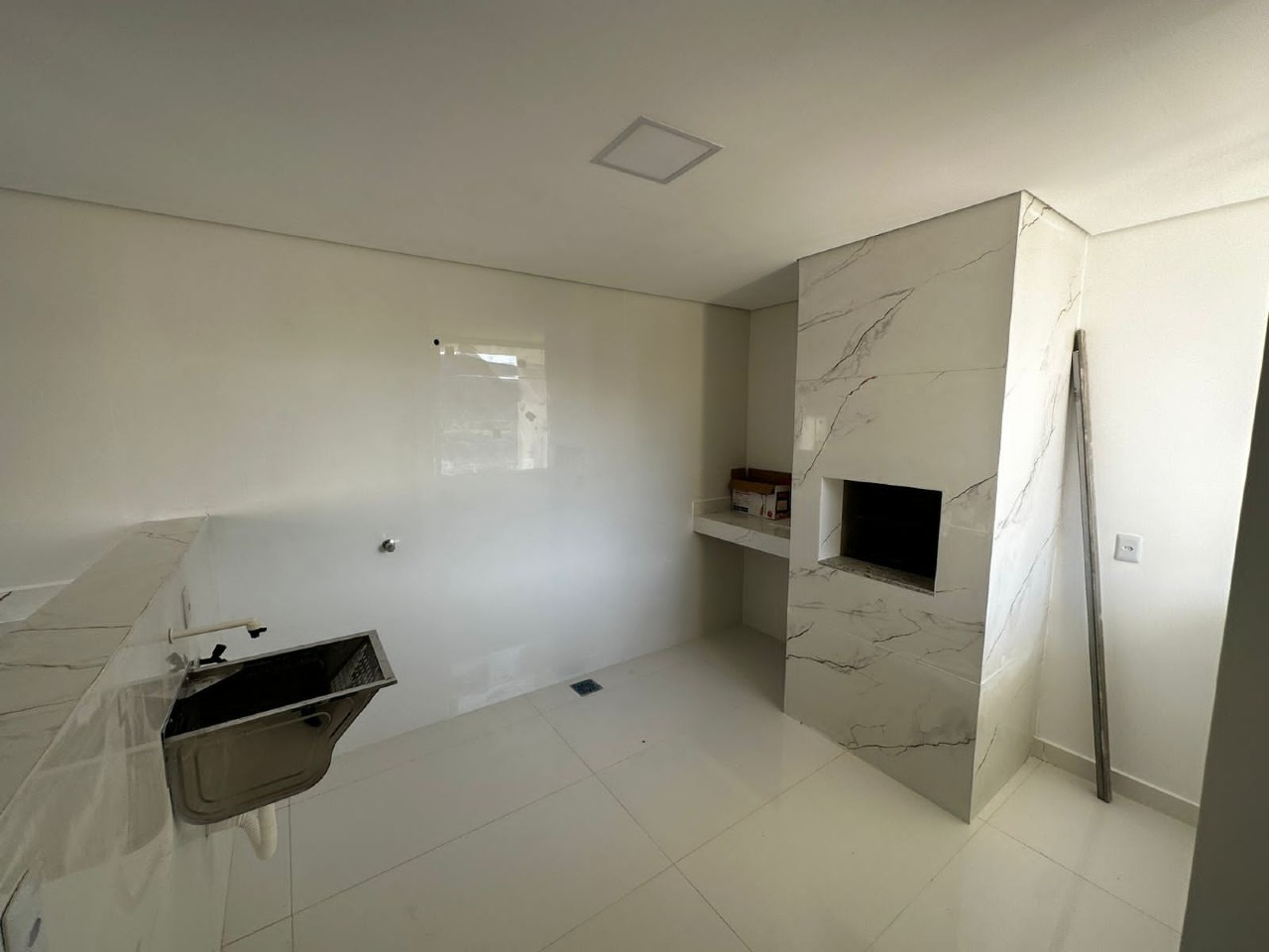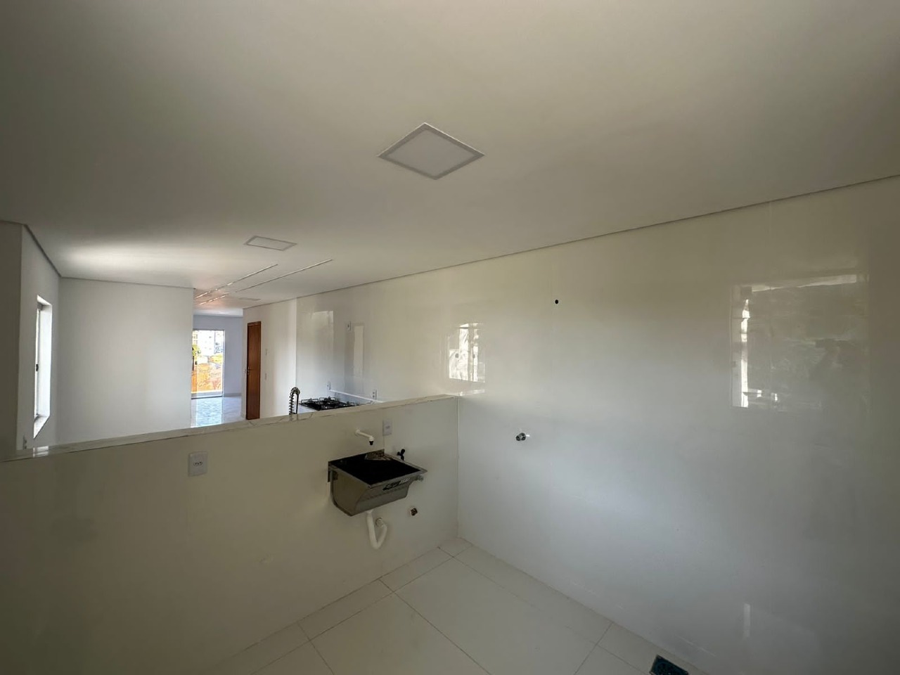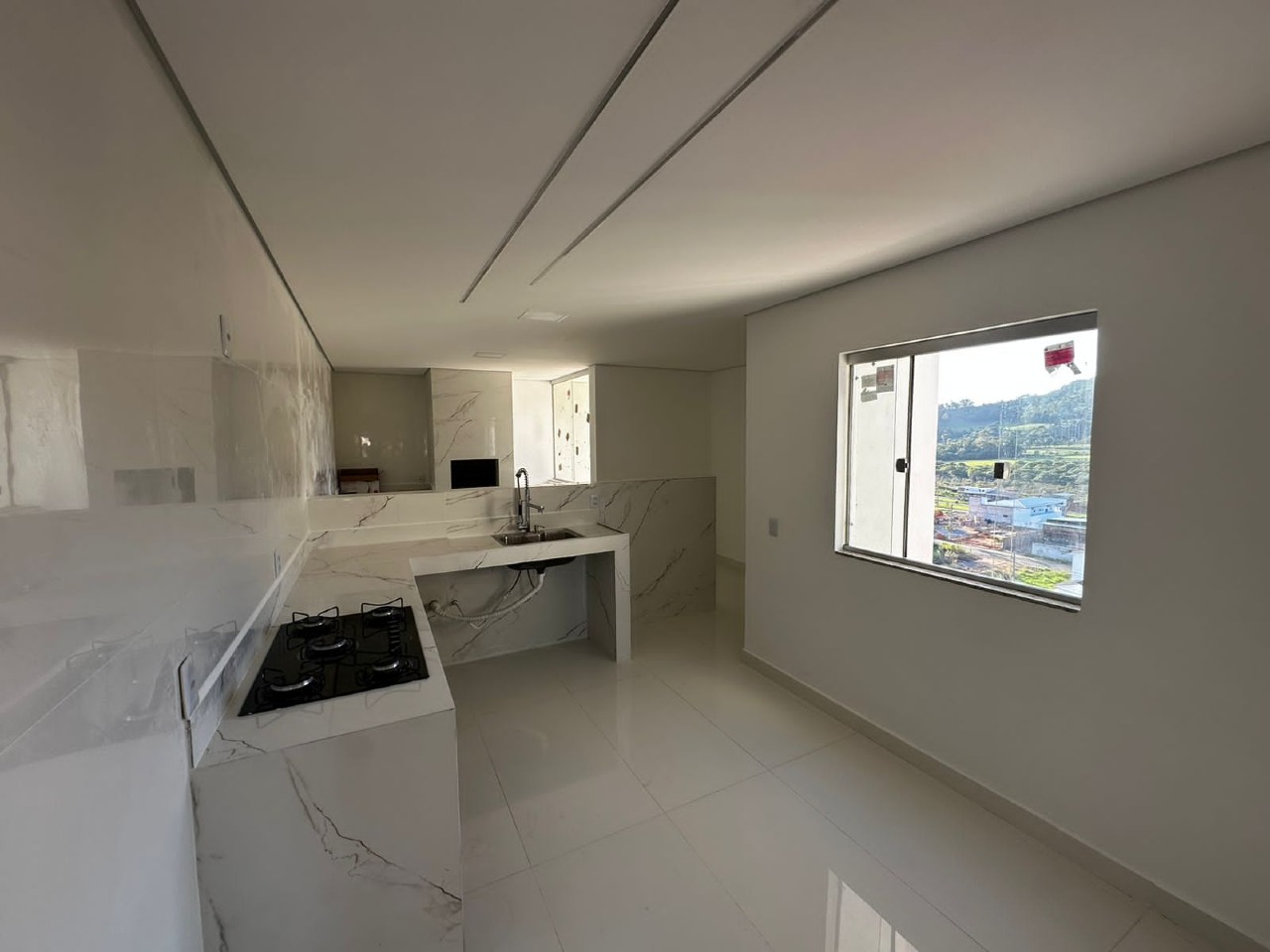 01 quarto, 01 suíte, banheiro social, cozinha com fogão cooktop, sala de jantar/estar, lavanderia, ar condicionado, área de serviço, varanda gourmet, churrasqueira, acabamento em porcelanato, 01 vaga livre na garagem, 03 varandas, água individual, alarme, interfone, portão eletrônico, sol da manhã.